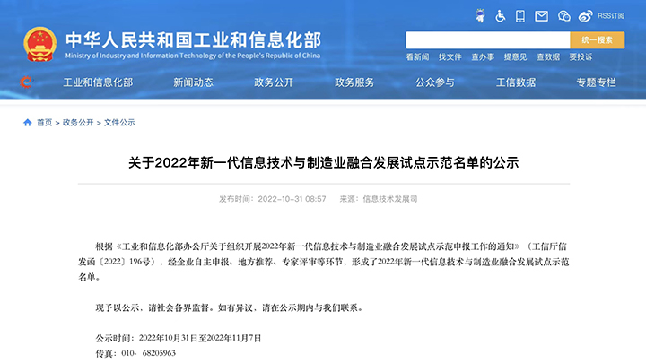 中爱体育电竞登录集团子公司入选工信部2022年新一代信息技术与制造业融合发展试点示范名单